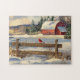Kardinal steht im Winter auf einem Holzzaun vor einer Scheune.
