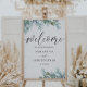 Schönes rustikales Eukalyptus Hochzeitszeichen für Ihren besonderen Tag. Mit elegantem, wasserfarbenem Blattwerk in Salbei grün auf weißem Hintergrund. Große Willkommenskalligraphie ist in einem coolen handgeschriebenen Schriftart. Einfach mit Ihren einzigartigen Informationen bearbeiten.