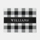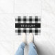 Diese klassische Schwarzweiss-Büffel-Karo-Musterfußmatte hat einen schwarzen Streifen über der Mitte mit einem Familiennamen im weißen Text. Personifizieren Sie mit Ihrem eigenen Namen oder als Geschenk zu geben.