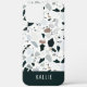 Rustikales Erdgrün und blaues Terrazzo Steinmuster, iPhone Gehäuse mit Namen. Koordinieren der Tab für tiefe grüne Farbblöcke mit der Koordination der Textzeile in Weiß.