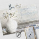 Schönes Design mit weißen Blume in einer weißen Vase mit Vintagen Ephemeriden in Blau-und Grautönen.