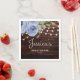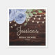 Rustikale, dunkelbraune Holzservietten aus Brautparty, mit glitzernden Saitenlampen und periwinkelblauen Aquarellblumen. Personalisiert mit dem Namen und dem Datum des Brautparty der Braut. Kontaktieren Sie uns für Hilfe bei der Anpassung oder der Anpassung von Produkten.