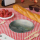 Rustikale Teller mit einem Reh in einem stillen Teich in einer Glade umgeben von einem Wald mit einem scheußlichen Gefühl und bedruckten und schwachen Aquarelltextur. Für rustikale Hochzeiten, Jäger-Beerdigungen und vieles mehr.
