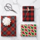Dieses Set von drei rustikalen Weihnachtsblättern enthält drei festliche karierte Muster für Feiertage. ein traditionelles kariertes Rot-, Weiß-, Gold- und Schwarztartan, ein klassisches Rot- und Schwarzbüffel-Buffalo Kariert, und ein lustiges Muster von wackeligen Weihnachtsbäumen in Rot und Grün Buffalo-karierten Mustern auf einem Retro- Gelb-Bräu.