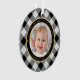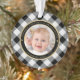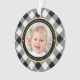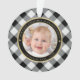 Dieser rustikale Weihnachtsschmuck für neue Großeltern bietet ein Foto an der Vorderseite, das mit einem goldfarbenen und schwarzen, kreisförmigen Rahmen auf einem karierten Hintergrund aus Büffel und Schwarz umgeben ist. In den Imitate lesen die Worte "Bucht unsere erste Weihnachtsfeier als Großeltern" in Gold-Typografie, die den Namen und das Jahr darunter enthält, um die Person zu personalisieren. Ein einzigartiges Geschenk für Erstgroßeltern. Designed by artist ©Susan Coffey.
