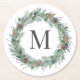 Elegantes, runder, weißer Untersetzer-Design mit rustikalem, elegantem, weißem Holzkorn mit einem Kranz im Winter Aquarell-Grün umrahmt ein Familiennamen / Familiennamen Monogramm Initial. Enthält eine weiße Hintergrundfarbe.