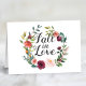 La carte de conseil mariage "Fall in Love" est élégamment pliée et présente une couronne rustique de fleurs d'aquarelle d'automne, y compris des roses, des dahlias, des fleurs de pivoines et de la verdure, dans une magnifique palette automnale de rouge bordeaux, jaune doré, rose roux et tons verts. Un motif de coordination bordeaux rayures habille le dos de la carte.