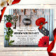 Invitation rustique à la fête de chauffage domestique avec un panneau en bois patiné avec frappe de porte et clé avec des fleurs rouges. Beau pour une première maison de couple ou une âme romantique ...