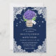 Invitations de mariage rustique violet et bleu avec un bouquet d'haleine d'hydrangée et de bébé à l'intérieur d'un bocal de mason sur un burlap et arrière - plan de dentelle fleurie. Un design de carte parfait pour inviter vos invités à votre fête de mariage campagnard rustique violet et bleu inspirée des fleurs d'hydrangée. Carte facile à personnaliser.