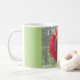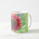 Diese fröhliche Tasse ist mit einer roten Rostblume versehen, die von der Sonne, die dahinter scheint, fast wie ein Gläschen leuchtet.