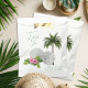 Sacs de mariage blanc avec dollars de sable tropical, palmier et fleurs design. Les hibiscus roses et les grands feuilles sont répartis sur deux dollars de sable blanc dans ce design. Un grand palmier est derrière le dollar de sable. "Merci" en vert en haut et noms avec date en bas. A utiliser pour les douches, ou les réceptions. Les sacs sont en série de 50, en papier blanc ou Kraft.