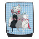 Ce sac à dos pour adultes Bold Face avec un visage interchangeable devant a un chat mère blanc souriant assis avec ses trois chatons en noir, blanc et gris tous portant des arcs sur un arrière - plan plaid bleu et blanc. Customisez votre nom avec le modèle.