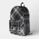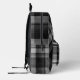 Black plaid backpack for adults or kids. All over plaid with name template on the front zipper pocket. Pine tree images, in shades of black and gray, make a little forest beneath the name. Use the name template, or don't.