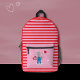 An adorable pink and red backpack for kids featuring a cartoon elephant , a stripe pattern and some tiny hearts on the sides . Personalize it with the child's initials .