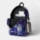 This vibrant backpack features abstract fluid art: deep purple and navy blue marbled swirl with pearlescent white cells, cosmic acrylic pour texture perfect for modern art prints. The front zippered pocket features a blueish purple sail boat art print.