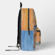 Un sac à dos ensoleillé orné d'un tableau représentant un coucher de soleil sur la plage et sur la poche d'un tableau représentant un voilier sur une ville côtière. De bonnes vibes pour l'été et toute l'année!