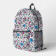 Joyful Backpack for Back to School or Cityscape - Flower Pattern blue Swirl Berry on a white Background Design is hand drawn and shows a seamless repeating floral pattern with green leaves and round orange berries. The main colors in this Pattern are, blue, magenta, mauve, pink, black, white.