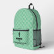 Mint green geometric pattern Christian backpack, featuring a cross. You can customize the text, including your own initials (or name if you prefer), your favorite book of the Bible, the chapter and verse, and you can include a short quote from the verse - or simply delete the quotation if you like to keep the design as just a simple book-chapter-verse style.