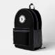 Le sac à dos noir élégant est doté d'un monogramme noir gras en cercle blanc avec une bordure noire étroite et une mince bague extérieure blanche. Ajoutez votre initiale dans la barre latérale.