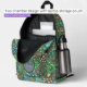 Ce sac à dos imprimé personnalisable présente un design graphique dynamique et complexe. Les couleurs sont riches et variées, dans des tons verts, bleus, roses, jaunes et violets. Le style de la motif allie des éléments de cachemire à une touche moderne, avec des motifs floraux, des tourbillons et des formes feuillues denses, afin de créer une composition attrayante. L'option de personnalisation du texte vous permet de personnaliser le sac à dos avec votre propre nom ou tout autre texte souhaité. La police utilisée pour la personnalisation est élégante mais lisible par rapport à l'arrière - plan complexe.