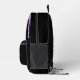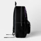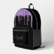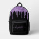 Sac à dos noir chic, élégant et ceinturé personnalisé avec gouttes de parties scintillant violet. Personnalisez avec votre nom dans un script élégant et tendance violet clair avec des swashes. Vous pouvez ajuster la taille de la police de script dans l'outil de conception pour des noms plus courts ou plus longs.
