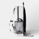 Backpack with a very cute penguin design, white with a pattern of penguin faces. The penguins are in classic colors of white, black, and orange, with happy expressions. Front zippered pocket and black top handle for easy carrying. On the side of the backpack, there is a mesh pocket for holding water bottles. Perfect backpack for school or hiking, thanks to its cheerful and functional design!