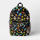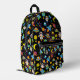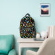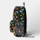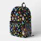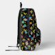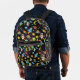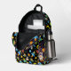 Un sac à dos de l'espace extra-atmosphérique coloré amusant avec des astronautes de dessins animés, des roquettes, des aliens. étoiles, lune et planètes sur un arrière - plan photographique noir à sens laiteux. Personnalisez en modifiant le nom de l'enfant (dans une police de couleur orange. Idéal pour offrir un cadeau pour les anniversaires ou pour retourner à l'école sac à dos.