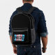 Backpack with text in the colors of the transgender pride flag. Pink, white, and blue flag of the trans pride movement, on a blue background