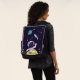 Un sac à dos avec un arrière - plan bleu foncé avec des étoiles jaunes éparpillées autour. Couché sur le dessus est l'illustration d'un astronaute vêtu d'une combinaison blanche flottant au-dessus de la lune. Au loin se trouve une planète avec des anneaux et un vaisseau-fusée qui s'envole dans le ciel à la recherche de nouveaux mondes à explorer.