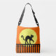 Ce carrosserie tout en imprimé sur le sac a un chat noir éffrayant avec des yeux verts qui marchent sur le sommet d'une clôture noire ornée devant une pleine lune jaune sur un arrière - plan orange à l'avant et au dos.
