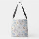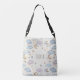 Ce sac carrossable personnalisé pour enfants présente une illustration schématique d'étoiles joueuses, de lunes de croissant et de nuages moelleux à l'aquarelle pastel douce.