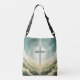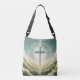 Croix d'or bleu doux parmi les nuages avec design typographique doré.