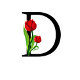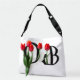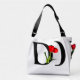 Un élégant sac fourre-tout blanc présente une lettre noire audacieuse, "D", ornée de tulipes rouges éclatantes. Le design des sacs est propre et moderne, les tulipes apportent une touche de nature et de couleur à l'arrière - plan minimaliste.