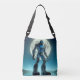 Sasquatch se dresse sous une pleine lune entourée de montagnes, révélant un exosquelette de titane de circuits électroniques et de lumières LED...