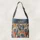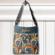 This monogrammed bag is a mix of modern and retro with colorful jazzy swirls and dots. Colors include a trendy vintage color palette of gold, light orange, deep orange, dark teal, blue, navy, black, and cream. Your monogram name appears in a swirly typeface font in light orange against a color block of deep teal blue.