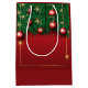 Un sac cadeau festif rouge orné de branches de pin vert et d'ornements rouges brillants. Le sac présente une finition brillante, rehaussant ses couleurs vives. Les poignées sont blanches, offrant un contraste saisissant par rapport à l'arrière - plan rouge riche.