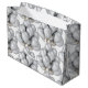 Le sac cadeau en papier est affiché dans une couleur blanche avec une finition brillante avec une impression festive de ballons couleur argent. Grand format montré Customiser ce sac cadeau ou acheter tel quel.
