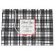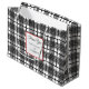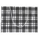 Un sac cadeau modifiable avec script et lettres décoratives sur un carré encadré en rouge sur un motif plaid horizontal d'inspiration noir et blanc avec de fines rayures.