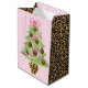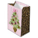 This Christmas gift bag has a Christmas tree with leopard print ornaments.