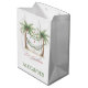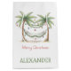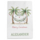 This fun coastal holiday inspired Christmas holiday gift bag features palm trees decorated with ornaments and a hammock on each side. Personalize with your choice of name or special text on the front and back. Great for personalized holiday party decorations and party favor gift bags.