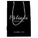 Script moderne Black and White Personnalisé Bridesmaids Sac cadeau avec nom de femme d'honneur personnalisée en blanc style de police de script moderne avec titre et date mariage dans le style de police sans serif moderne sur arrière - plan noir. Aussi parfait pour Maid of Honor, Flower Girl, Mother of the Bride, Groomsmen, Best man et plus.