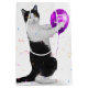 Chat noir et blanc avec ballon violet et confetti sur arrière - plan blanc pour 8ème anniversaire. La couleur arrière - plan blanche peut être changée.