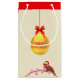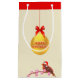 Beau sac cadeau avec une grande boule de Noël dorée et petit oiseau de Noël sur arrière - plan beige clair.