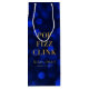 Élégant sac cadeau de vin avec les mots "Pop Fizz Clink" en faux papier doré contre un saphir bleu bokeh lampes motif arrière - plan. Idéal pour les fêtes de fiançailles, les mariages, les anniversaires ou autres événements.