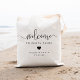 Bienvenue invités à votre mariage de destination avec ces sacs fourre-tout personnalisés chic et modernes. Design caractéristiques "bienvenue" dans un script de calligraphie manuscrit moderne, avec espace pour personnaliser avec votre emplacement mariage, les noms et la date. Une petite illustration de silhouette de coeur complète le design.