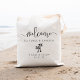Bienvenue invités à votre mariage de destination avec ces sacs fourre-tout personnalisés chic et modernes. Design caractéristiques "bienvenue" dans un script de calligraphie manuscrit moderne, avec espace pour personnaliser avec votre emplacement mariage, les noms et la date. Une paire de silhouettes de palmiers complète le design.