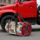 A gray duffle bag is covered in a vibrant pattern of red fire trucks, complete with ladders and fire axes, set against a light-colored ground with yellow splashes. A prominent side pocket, adorned with a red fire department emblem, proudly displays "FIRE RESCUE," "JENNY SAMSMITH," "FIRE DEPARTMENT," and "Vancouver B.C.," creating a personalized and functional item for a firefighter. Personalize with your name and department home town and more. monogram