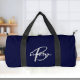 Ce sac en duffel personnalisé est doté d'un monogramme et d'un prénom en écriture moderne gris et blanc sur un arrière - plan bleu marine élégant.