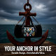 This black duffle bag showcases four vertical panels featuring charming watercolor-style nautical elements: an anchor with fish and flowers, a sailboat on waves, a seashell with small fish, and a lighthouse with a dolphin, all under the text "NAUTICAL VIBES." Edit color of the bag caps and body in the Design tool to your favored colors.