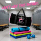 This black duffle bag features a vibrant graphic of a silhouetted figure (possibly a dancer or gymnast) leaping with arms outstretched, radiating energy. Above the figure, "I'M OVERWHELMED" is in large white letters, with "With Excitement" below, conveying a humorous and positive spin on feeling overwhelmed. This design is perfect for highly enthusiastic individuals. Edit color of the bag caps and body in the Design tool to your favored colors.